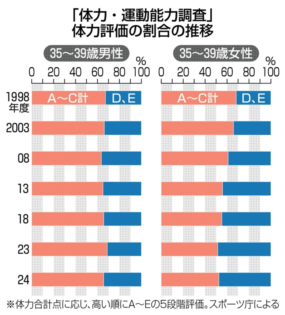 • 30代後半女性の体力低下 スポーツ庁の24年度調査、他世代に比べ運動不足か